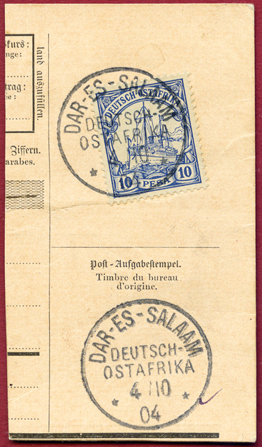04.10.04: 10Pesa (Mi.14) auf großem Postanweisungsabschnitt, zwei saubere Abschläge DAR-ES-SALAAM, rückseitig violetter Stempel "Missionsstation Tanga" und Unterschrift des Missionskaufmanns Thiel.