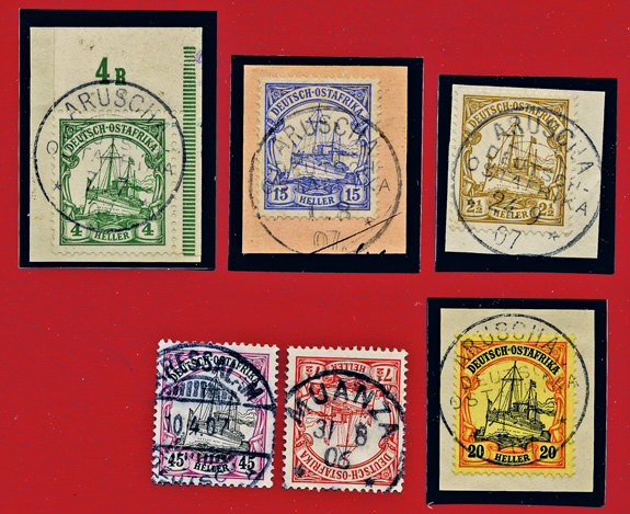 1905: kleines Lot von 2 gebrauchten Marken & 4 Briefstücken mit Werten 2 1/2H, 4H, 7 1/2H 15H, 20H & 45H (Mi.22-26, 28) mit 4x Stempel ARUSCHA, 1x MUANZA & 1x DARESSALAM (ArGe 4).