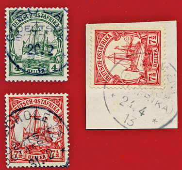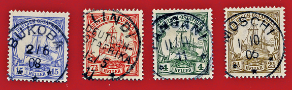 1906: kleines Lot von 4 gebrauchten Marken mit Werten 2 1/2H, 4H, 7 1/2H & 15H (Mi.30-33) mit Stempel MOSCHI, PANGANI, LINDI & BUKOBA.