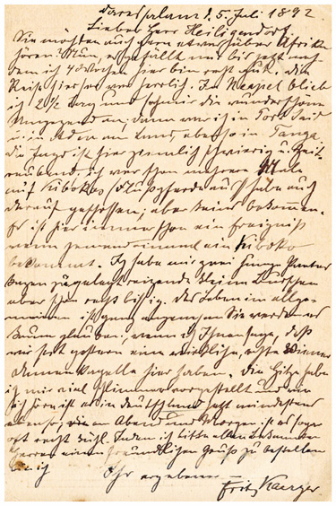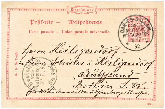 06.07.1892: 10Pf Vorläufer-GSK (MI.VP21) mit Stempel DAR-ES-SALAAM KDPA (ArGe Type 1, 100 Euro) an die Firma Schüler & Heiligendorf in BERLIN (27.7.92). Der Text schildert die Reise und Erfahrungen des Autors "Fritz K.." nach und in Ostafrika.