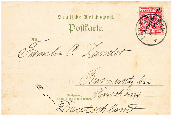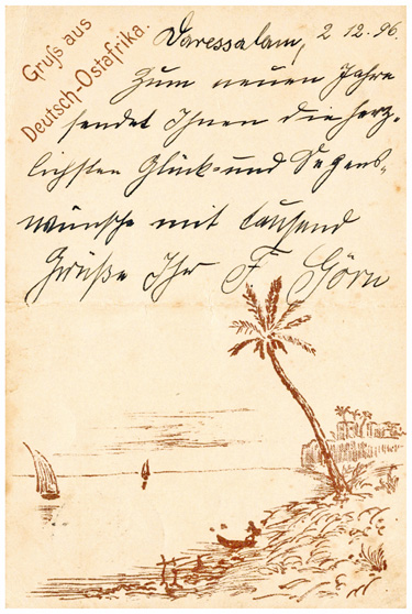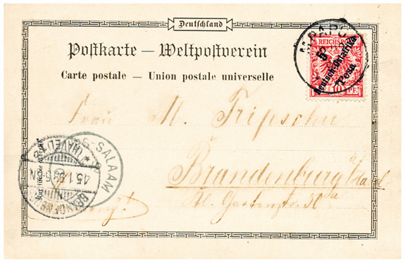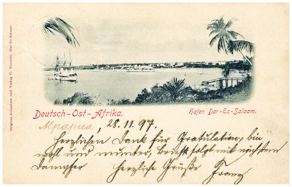 07.12.1896: DR 10Pf mit Stempel DAR-ES-SALAAM auf Bedarfs- Postkarte an Familie Zander in Barnewitz; rs skizierte Uferansicht mit Betitelung "Gruss aus Deutsch-Ostafrika". Mittelfalte.