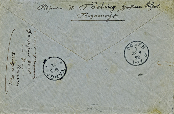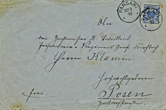 30.08.1892: Vorläuferbrief mit 2x Stempel PANGANI auf 20Pf (Mi. V48b - Marke beschädigt) an Herrn Klamm bei dem Infrantrie-Regiment Graf Kirchbach in POSEN (22.9.92). Absender ist "H.Beling Feldwebel../Bagamoyo" mit Transitstempel TANGA (31.8.92). Vorläuferbriefe aus Pangani sind selten. Farbgeprüft Dr.Steuer BPP, Michel x4 = 1200 Euro.