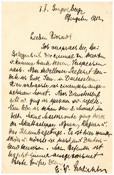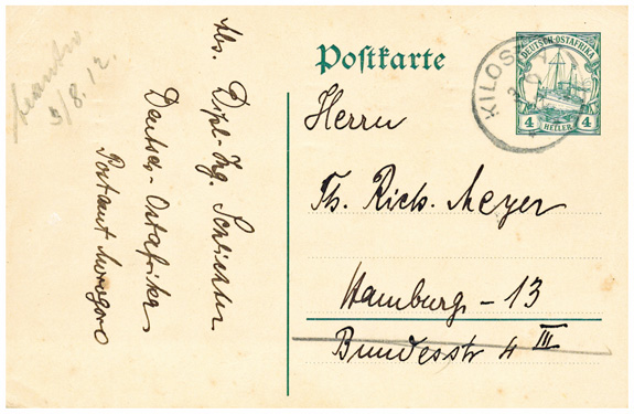 03.06.12: 4H GSK (Mi.P23) mit Stempel KILOSSA geschrieben in "Gongweberge, Pfingsten 1912" nach Hamburg. Der Landmesser E.W. Schlichter von der Vermessungstruppe an der Mittellandbahn schreibt "..lebe ich schon den 3.Monat im Zelt. Meine Marschroute ging durch die Mkattasteppe, Nguru, Kaguru und das Ithumbagebirge. Es ist hier wunderschön..".