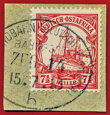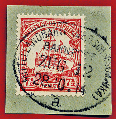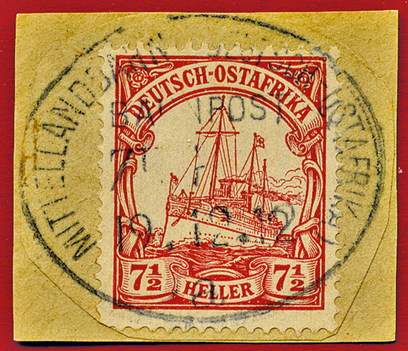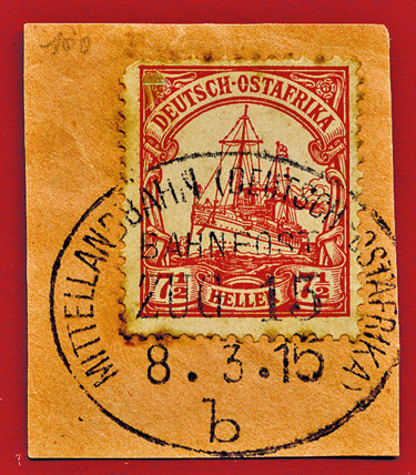 15.07.1913, Mittellandbahn: Briefstück mit 7 1/2 Heller (Mi.32) und klarem Stempel MITTELLANDBAHN (DEUTSCH OSTAFRIKA) BAHNPOST ZUG 14b; ex Sammlung Siebentritt.