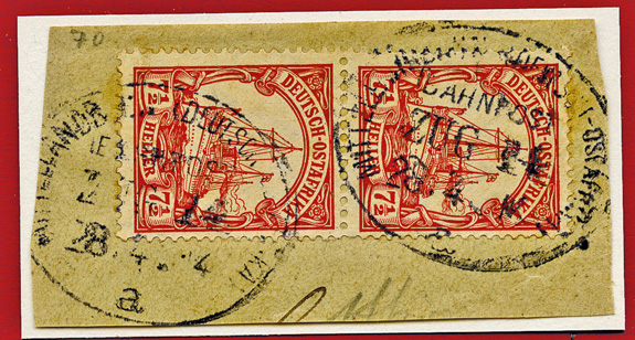 28.04.1914, Mittellandbahn: Briefstück mit 2x 7 1/2 Heller (Mi.32) und 2x klarem Stempel MITTELLANDBAHN (DEUTSCH OSTAFRIKA) BAHNPOST ZUG 14a; ex Sammlung Siebentritt.