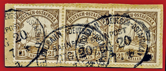 15.07.1915, Mittellandbahn: Briefstück mit 3x 2 1/2 Heller (Mi.30) und 3x Stempel MITTELLANDBAHN (DEUTSCH OSTAFRIKA) BAHNPOST ZUG 20a; ex Sammlung Siebentritt.