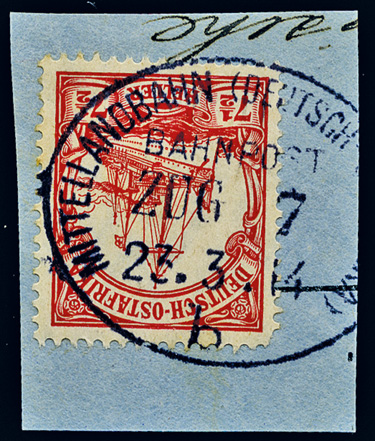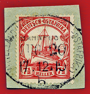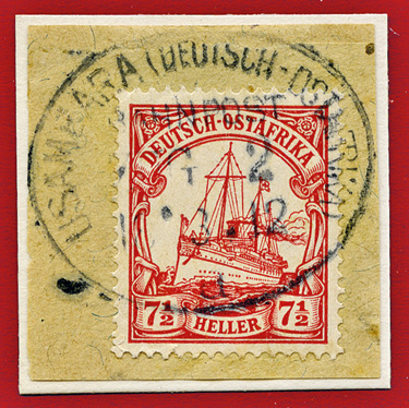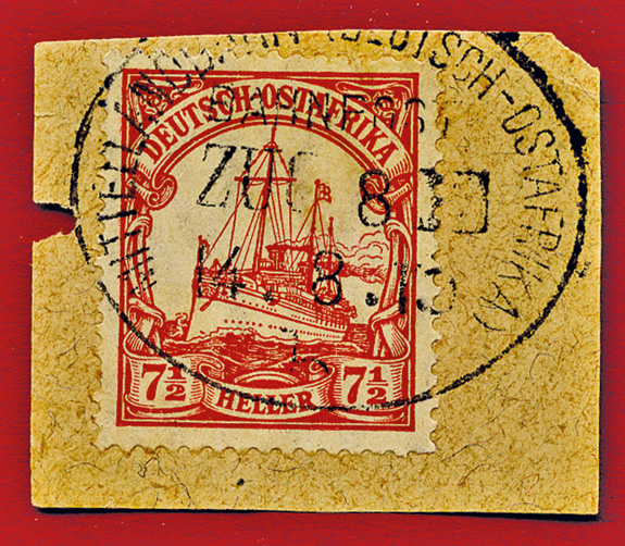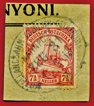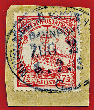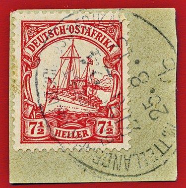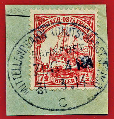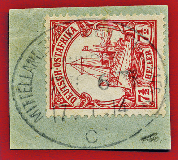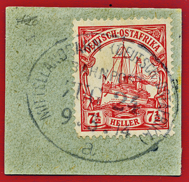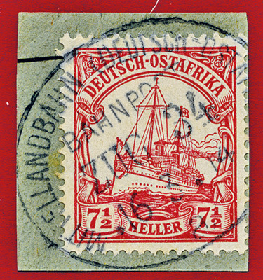 25.08.1913, Mittellandbahn: Briefstück mit 7 1/2 Heller (Mi.32) und klarem Stempel MITTELLANDBAHN (DEUTSCH OSTAFRIKA) BAHNPOST ZUG 24b; ex Sammlung Siebentritt.