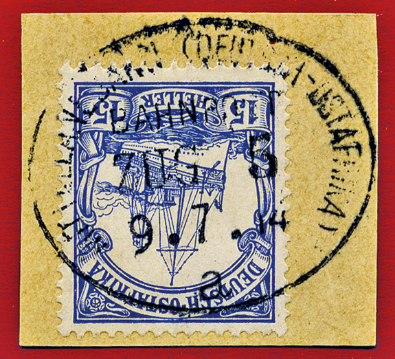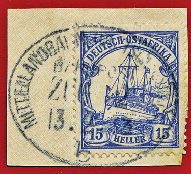 13.02.1913, Mittellandbahn: Briefstück mit 15 Heller (Mi.33 & klarem Stempel MITTELLANDBAHN (DEUTSCH OSTAFRIKA) BAHNPOST ZUG 2b; ex Sammlung Siebentritt.