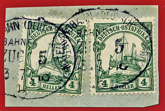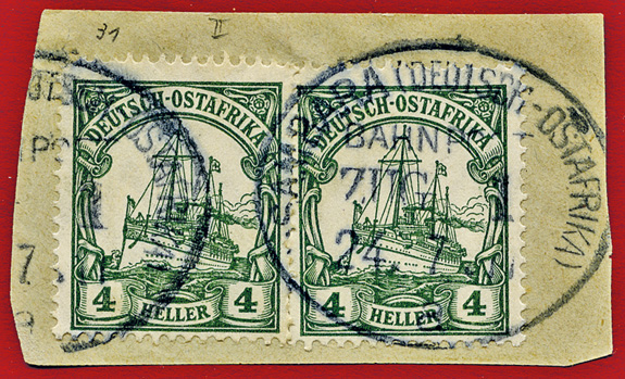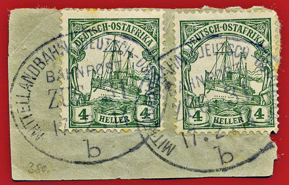 17.12.1914, Mittellandbahn: Briefstück mit 2x 4 Heller (Mi.31) und 2x klarem Stempel MITTELLANDBAHN (DEUTSCH OSTAFRIKA) BAHNPOST ZUG 31b; ex Sammlung Siebentritt.