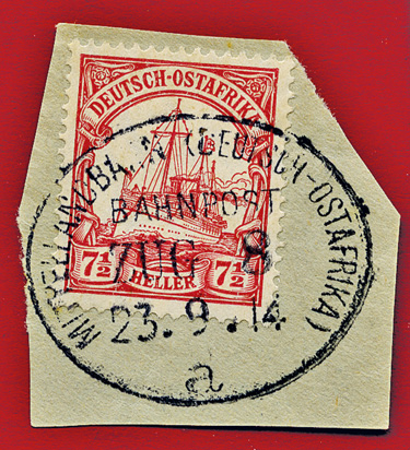 16.03.1914, Mittellandbahn: Briefstück mit 7 1/2 Heller (Mi.32) und klarem Stempel MITTELLANDBAHN (DEUTSCH OSTAFRIKA) BAHNPOST ZUG 34a; ex Sammlung Siebentritt.