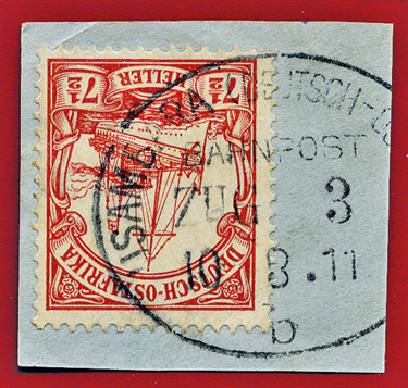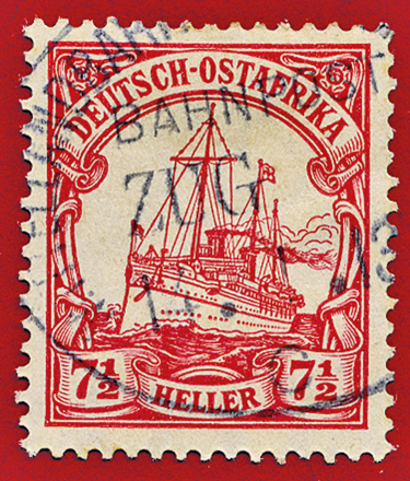 1910: 7 1/2 H (Mi.32) mit Bahnpoststempel USAMBARA ZUG 3, mit kopfstehender "3".