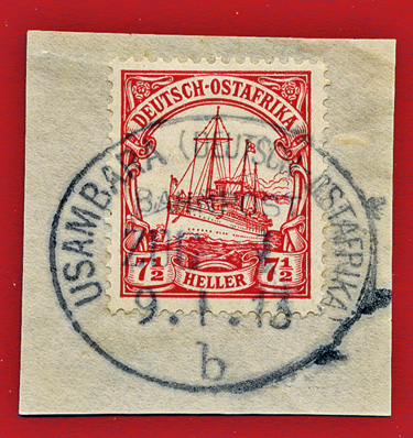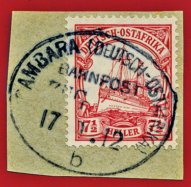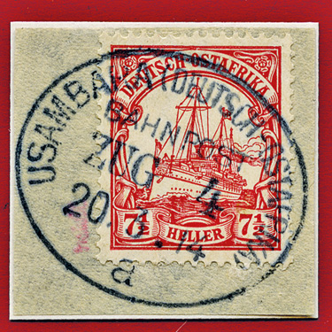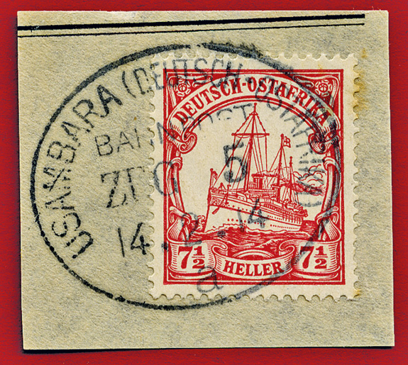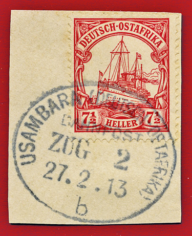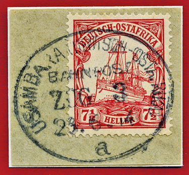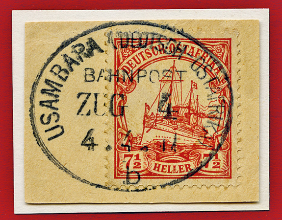 17.09.1912, Usambarabahn: Briefstück mit 7 1/2 Heller (Mi.32) & klarem Stempel USAMBARA (DEUTSCH OSTAFRIKA) BAHNPOST ZUG (ohne Nummer) "b" ; aus der Sammlung Siebentritt.