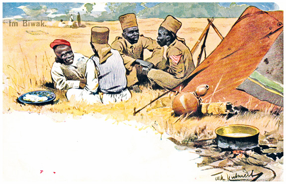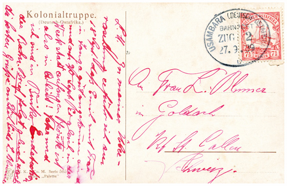 27.09.1909: 7 1/2H (Mi.24) auf Bedarfs-Ansichtskarte "Kolonialtruppe" (Askaris im Biwak) mit Bahnpoststempel USAMBARA ZUG 2 "b" nach St.Gallen/Schweiz; im Text wird u.a. erwähnt:"..Vater und ich sind in Buiko, Endstation der Bahn..".
