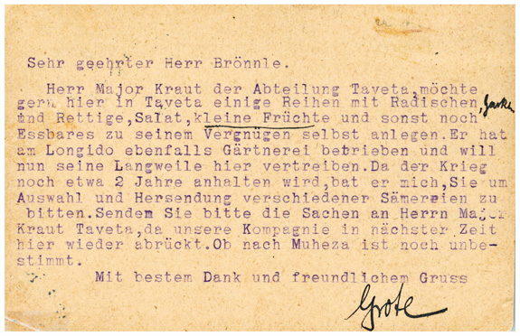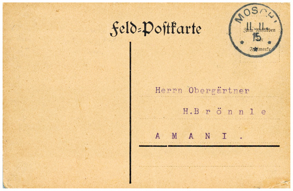 11.11.1915: MOSCHI auf Feldpostkarte aus Taveta an Herrn Obergärtner Brönnle in Amani mit interessantem Text:"..da der Krieg noch etwa 2 Jahre anhalten wird..Senden Sie bitte die Sachen an Herrn Major Kraut Taveta, da unsere Kompagnie in nächster Zeit hier wieder abrückt. Ob nach Muheza ist noch unbestimmt..". Ab dem 1.6.1915 wurde Post aus Taveta nach Aufhebung der dortigen Feldpoststation mit dem Stempel "MOSCHI" versehen, sehr selten (ArGe 300 Euro). Ecke rechts unten bügig.