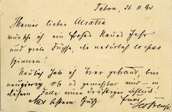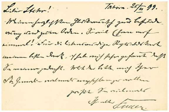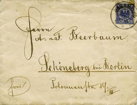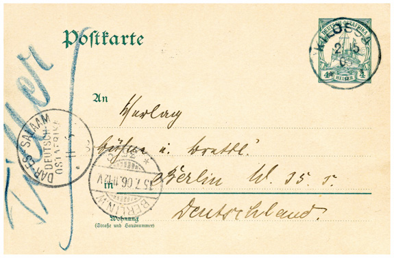 27.03.1899: 5 Pesa GSK (Mi.P6) mit Stempel TABORA über DES (8.5.99) an Major Stehr im Kriegsministerium Berlin (8.6.99); Absender ist Hauptmann Harry Puder (später in DSWA und ab 1907 Kommandeur der Schutztruppe in Kamerun).