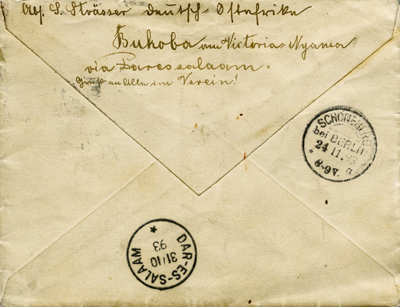 30.10.1893: 20Pf (Mi.V48d) mit Stempel BAGAMOYO über DES (31.10.93) nach Schöneberg (24.11.93). Absender ist der Lazarettgehilfe Sigmar Strässer aus "Bukoba am Victoria-Nyansa"; er starb kurz nach seiner Rückkehr in Hamburg am 10.7.94 an Malaria.