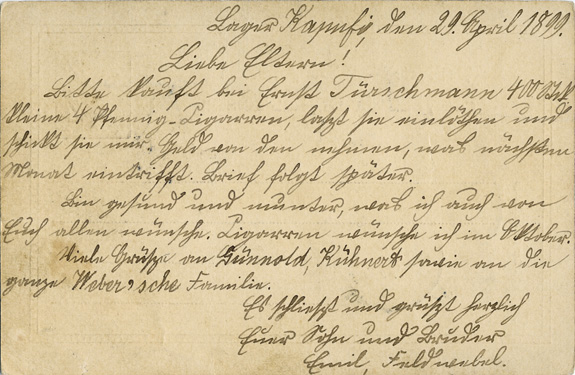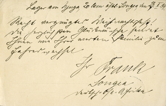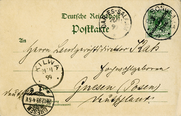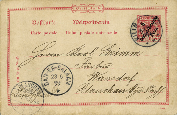 05.06.1899: 5 Pesa GSK (Mi.P6) mit Stempel KILIMATINDE über DES (23.6.99) nach Glauchau (17.7.99). Absender ist Feldwebel Emil Grimm vom "Lager Kapufi, den 29.April 1899", er bestellt sich Zigarren bei seinen Eltern. Beleg von den anhaltenden Expeditionen gegen räuberische Elemente im Raum Iramba/Issansu, Turu und Ussandui (vgl. Nigmann S.63).