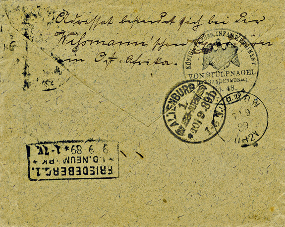 Der Araberaufstand 1888/90 - Kämpfe gegen Buschiri 6.9.1889: Brief aus ALTENBURG an den "Herrn Sec. Lieutn. Johannes / Inf. Reg. No.48" in Cüstrin, weitergeleitet nach GURKOW (7.9.98), FRIEDEBERG (9.9.89) und zurück nach ALTENBURG (10.9.89). Rückseitig Vermerk "Adressat befindet sich bei der Wissmann'schen Expedition in Ost-Afrika" & Dienstsiegel "KÖNIGL. PREUSS. INFANT. REGIMENT VON STÜLPNAGEL (5.BRANDENBURG) No.48 I.BATAILLON". Anm.: Sec. Lieutnant Johannes nahm als Führer einer Sudanesen-Kompagnie an den Kämpfen in Ostafrika teil.