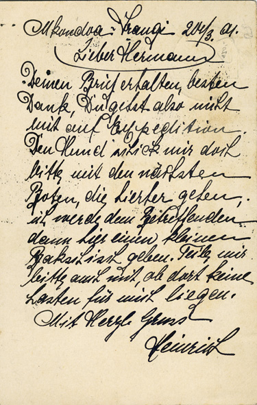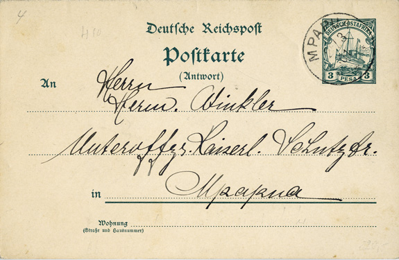 20.03.01: 3 Pesa GSK (Mi.P13) an Unteroffizier Hermann Winkler in MPAPUA (erst bei Ankunft dort abgestempelt); Karte geschrieben in "Mkondoa-Irangi".