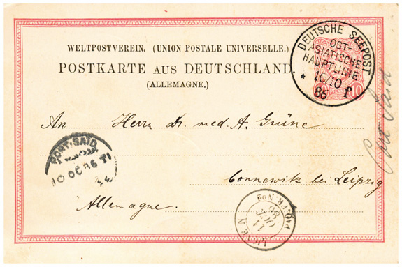 10.10.1886: glasklarer Seepoststempel OST-ASIATISCHE HAUPTLINIE "*f" (= Dampfer "Braunschweig" auf erster Fahrt nach Ostasien mit Ankunft Schanghai am 8.11.1886, vgl. Koch) auf 10Pf Ganzsachenkarte (Mi.VP8) nach "Connewitz bei Leipzig". Transitvermerk & -stempel "PORT-SAID" und französ. Seepoststempel "Ligne N". Es handelt sich um den bisher frühesten bekannten Beleg mit diesem DSOAHL "*f" Seepoststempel! In dieser Form sehr selten.