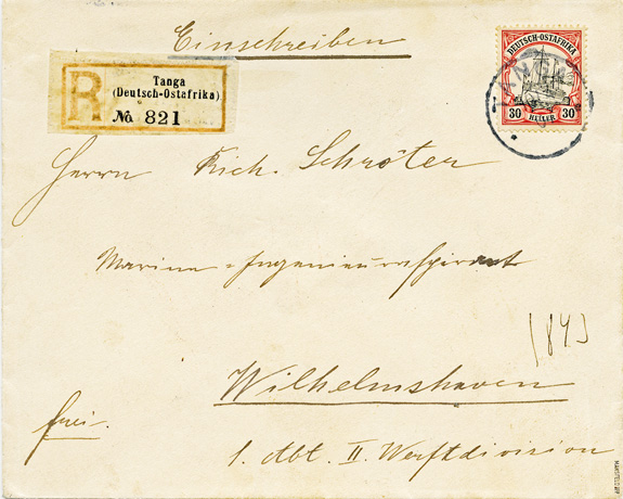 10.04.1907: 30H (Mi.27) mit Stpl TANGA auf R-Brief nach WILHEMSHAVEN (29.4.07); R-Zettel Type 5a. Abs.: "..S.M.S Seeadler / z.Zt Tanga". Mängel.