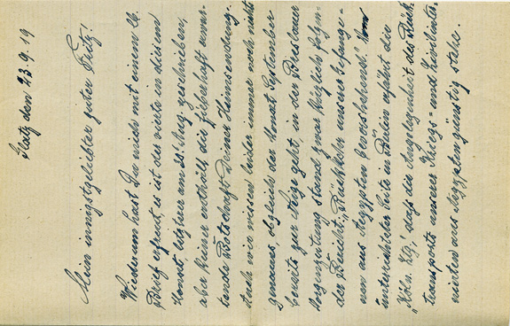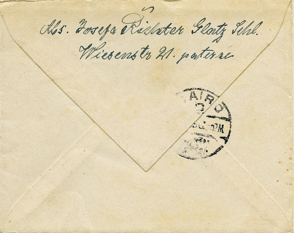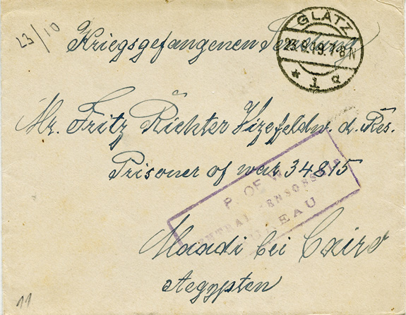 23.09.1919: Kriegsgefangenenbrief mit Inhalt aus GLATZ an den internierten "Fritz Richter Vizefeldw. d. Res" (Nr 34815) im Lager Maadi bei Kairo mit violettem Zensur-Rechtecksstempel "P OF W / CENTRAL CENSORSHIP BUREAU". NB: Fritz Richter war Postassistent in Deutsch Ostafrika.
