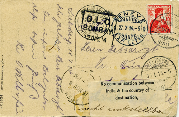18.07.14: AK aus SEELISBERG/Schweiz kurz vor Kriegsbeginn nach DES adressiert, mit TrSt ADEN (16.11.) & BOMBAY (12.12), sowie Aufkleber "No communication between India & the country of destination" nach Seelisberg (4.1.15) zurück.