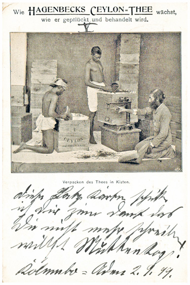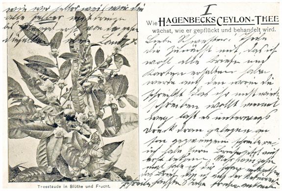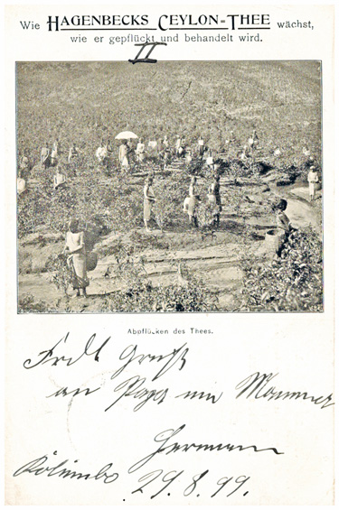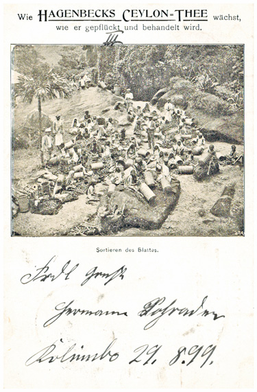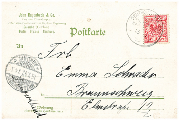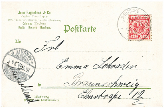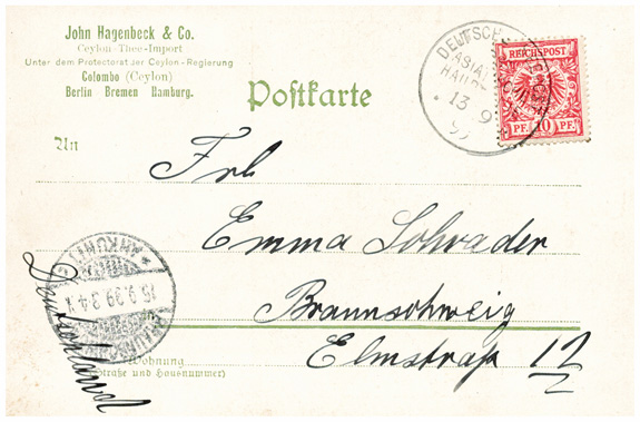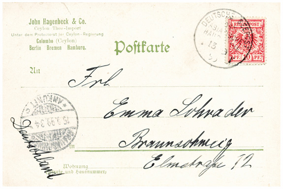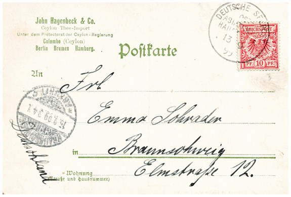 13.09.1899, Korrespondenz "Emma Schrader": kleines Lot von 5 Ansichtskarten "Wie Hagenbecks Ceylon-Thee wächst, wie er gepflückt und behandelt wird". Durchnummeriert von 1 bis 5, wird gezeigt: die Pflanze, die Ernte, das Abwiegen, das Sortiern und Verpacken des Tees. Alle Karten mit DR 10Pf und Seepoststempel OST-ASIATISCHE HAUPTLINIE aus Colombo (Ceylon) an Emma Schrader in BRAUNSCHWEIG (15.9.1899).