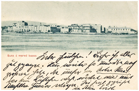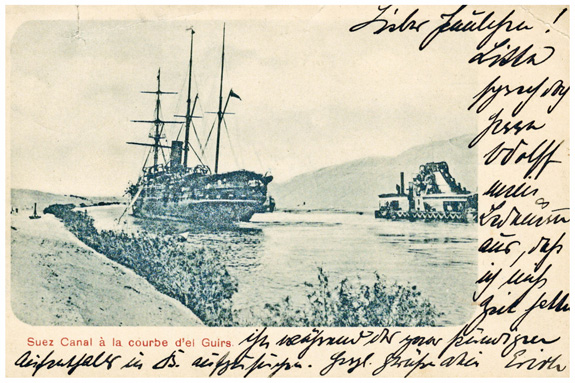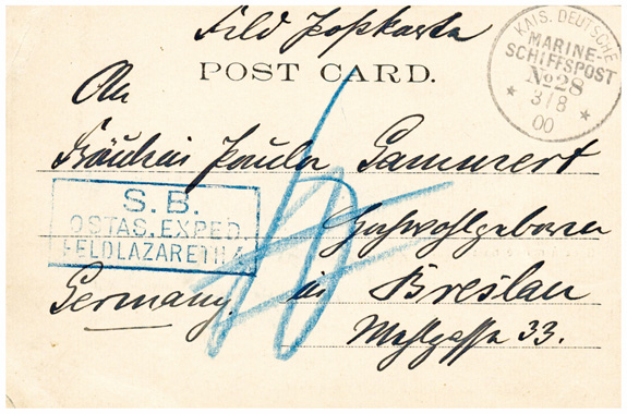 1900: zwei Feldpostkarten (3.8. & 7.8.) mit Suezkanal Motiven und Seepoststempel MSP No.28 (= SMS Batavia) sowie blauem Soldatenbrief- stempel "OSTAS.EXPED.FELDLAZERTH 4" an Fräulein Gammert in BRESLAU.
