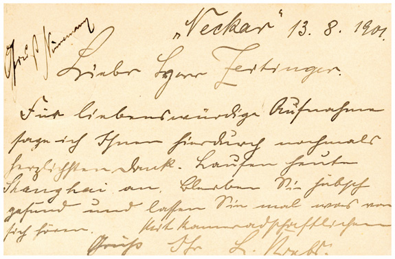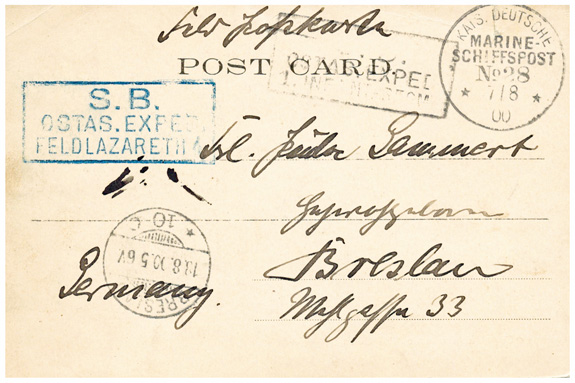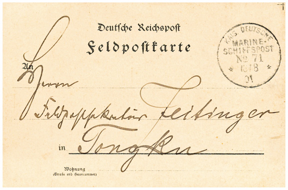 13.08.1901: Feldpostkarte mit Seepoststempel MSP No.71 (= SMS Neckar) an den "Feldpostsekretär Zeitinger in Tongku"; Post von der Liegezeit in China & auf der Heimreise.