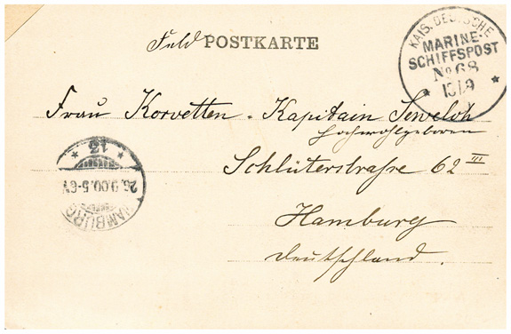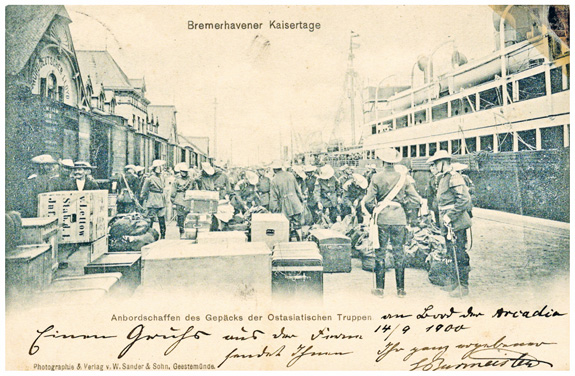 13.09.1900: Feldpost-Ansichtskarte "Bremerhavener Kaisertage. Anbordschaffen des Gepäcks der Ostasiatscihen Truppen" mit Seepoststempel MSP No.68 (SMS "Arcadia") an die Frau eines Korvetten-Kapitäns in HAMBURG (26.9.1900).