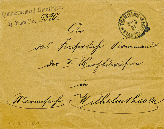29.05.1901: Brief als "Marinesache" und L2 "Gouvernement Kiautschou H.Buch No 5390" mit Stempel TSINGTAU"a" an das "Kaiserliche Kommando der II.Werftdivision" in WILHELMSHAVEN (7.7.1901); rs blasser Adlerstempel.
