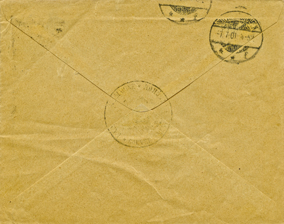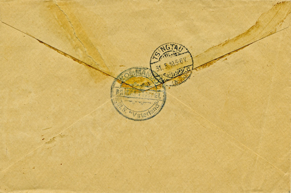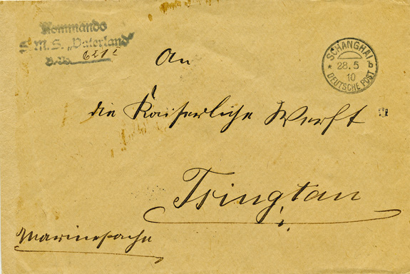 28.05.1910: Brief als "Marinesache" und L3 "Kommando / SMS Vaterland / B.No 621 I" mit Stempel SCHANGHAI"b" an die "Kaiserliche Werft" in TSINGTAU (31.5.10); rs blauer Briefstempel der "SMS Vaterland"; Klappe Mängel.