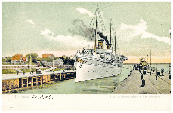 1905: ungebrauchte Litho-Ansichtskarte "S.M.Y. Hohenzollern in der Schleuse (bei Holtenau)"
