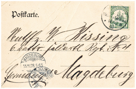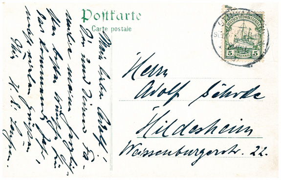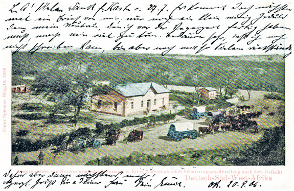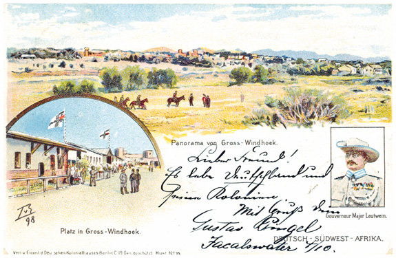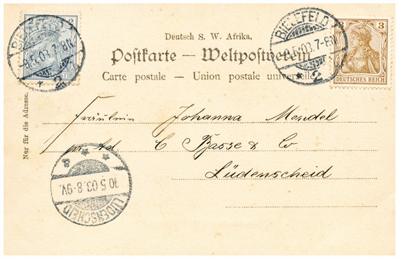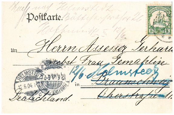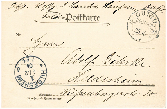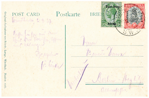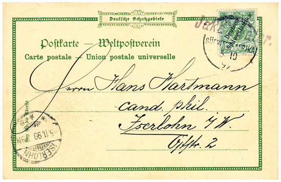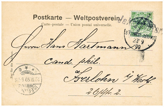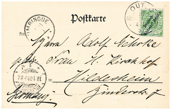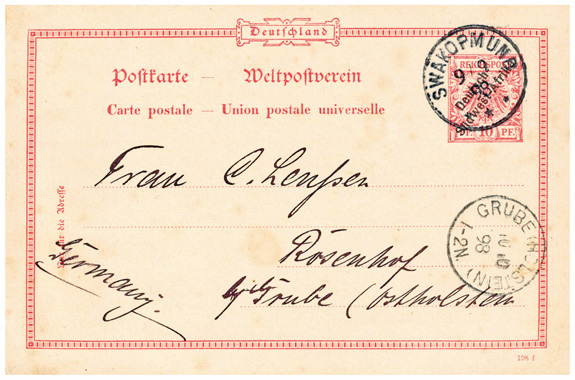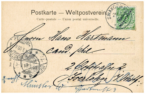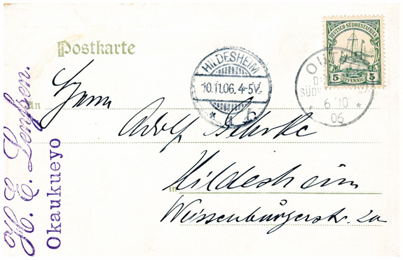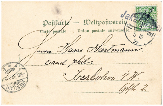 1898-1907: 8 GSK und Ansichtskarten aus der Emil Lenssen Korrespondenz (1x an seine Mutter in Rosenhof/Ostholstein und 7x an seinen Freund Adolf Gehrke in Hildesheim) mit Stempeln bzw. TrSt von Swakopmund, Outjo, Otjimbingue, DSLHW und Otjiwarongo und eine Karte mit Absenderstempel "H.E.Lenssen / Okaukuejo". Einige Karten mit interessanten Texten und Leitwegen. Lenssen veröffentlichte 1953 als fast Achtzigjähriger die "Chronik von Deutsch-Südwestafrika", die seitdem in 11 Auflagen erschien.