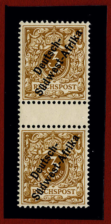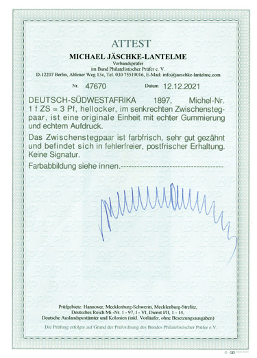 1897: senkrechtes Paar 3Pf (hellocker) mit Steildruck "Deutsch/Südwest-Afrika" (Mi.1fZS); Foto-Attest Jäschke-Lantelme "..sehr gut gezähnt..fehlerfrei..".