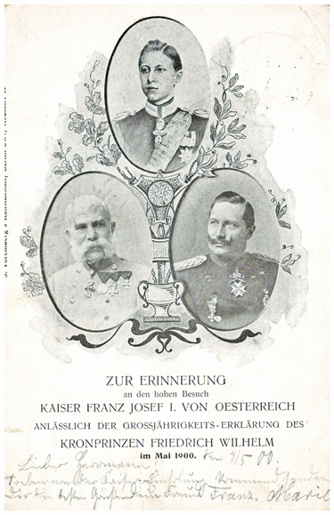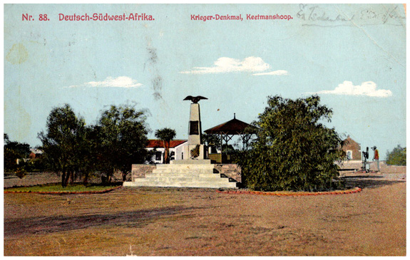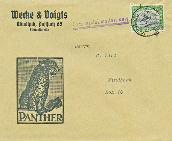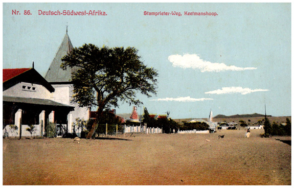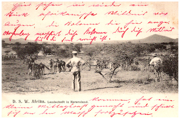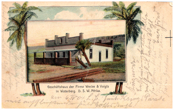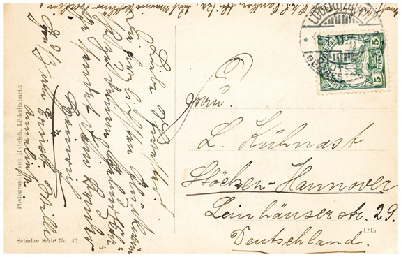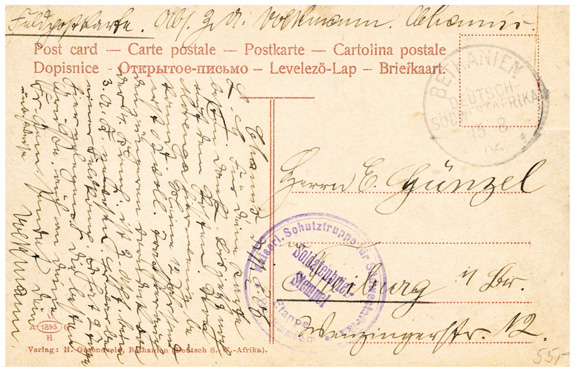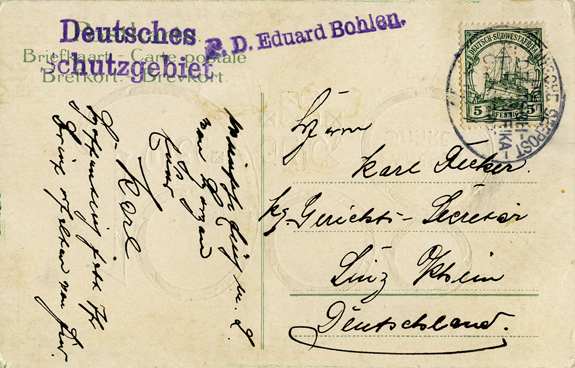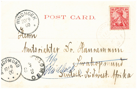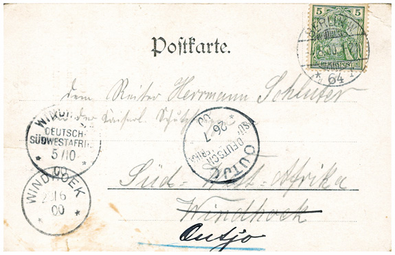 04.05.00: DR 5Pf auf AK (Besuch von Kaiser Franz Josef in Berlin) aus BERLIN an den Reiter Hermann Schlüter in WINDHOEK (28.6.00); da dieser sich auf der Nordexpedition der Schutztruppe befand, wurde die Karte nach OUTJO (26.7.00) weitergeleitet und dann zurück nach WINDHOEK (5.10.00). Marke kl.Eckfehler.