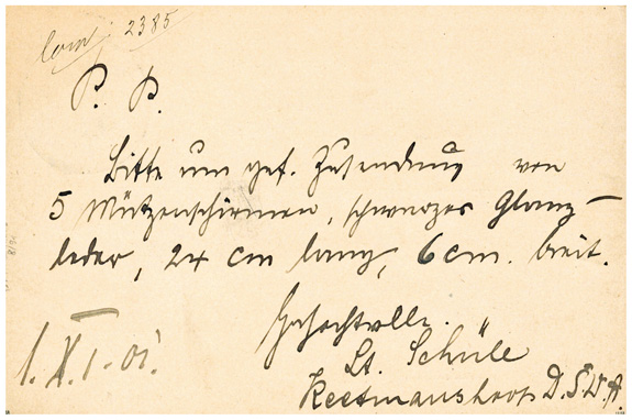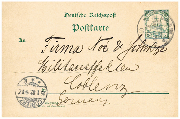 03.12.1901: 5Pf GSK (Mi.P13) mit Stempel UKAMAS an die "Firma Noe & Schulze / Militärartefakten / Coblenz". Absender ist Leutnant Schüle, der um Zusendung von Material bittet. Im August 1901 bis Mai 1901 ist er Führer des militärischen Begleitkommandos der dt.-engl. Grenzexpedition im Süden.