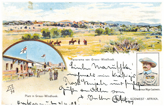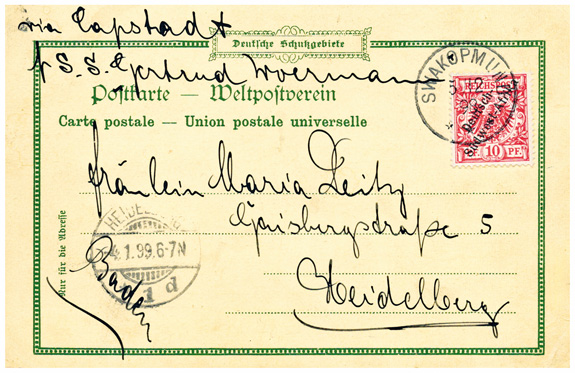 05.12.1899: 10Pf (Mi.3) mit Stempel SWAKOPMUND auf Feldpost-Ansichtskarte mit 3 Motiven u.a. von Gross-Windhoek & Gouverneur Major Leutwein mit Leitvermerk "via Capstadt p. S.S. Gertrud Woermann" nach HEIDELBERG (4.1.1899); der Umweg um Kapstadt verkürzte die Laufzeit um einen Monat.