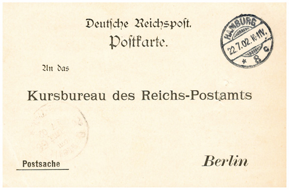 22.07.02: Laufzeit-Ermittlungskarte portofrei als "Postsache" von HAMBURG nach Berlin (22.7.02) an das "Kursbureau des Reichs-Postamts" mit rs Vordruck der Firma Carl Woermann und Mitteilung, daß "Gertrud Woermann" am 21.7. (statt 7.7.) in Capstadt angekommen sei und am 23.7. wieder abgehen würde. Selten!