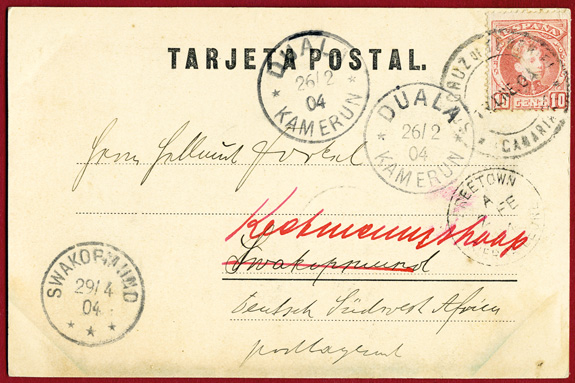29.04.04: Ankunftsstempel von SWAKOPMUND auf Ansichtspostkarte mit ungewöhnlichem Laufweg. Die Karte, frankiert mit 10 Cent. Spanien (Mi.208) und Stempel ST. CRUZ DE TENERIFE (17.01.04) wurde in FREETOWN SIERRA LEONE (02.02.04) um-spediert und landete am 26.02.04 in DUALA KAMERUN (2 saubere Abschläge). Erst zwei Monate später, kam die Postkarte in SWAKOPMUND an und wurde nach Keetmanshoop weitergeleitet.