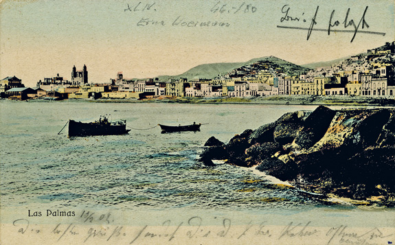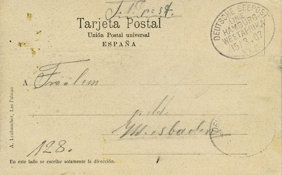 15.03.07: Feldpost-Ansichtskarte "Las Palmas" mit Stempel DSLHW"XLIV" (Dampfer "Erna Woermann", 128.Rückreise)