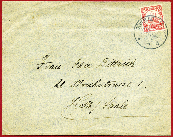 04.05.11: 10Pf (Mi.26) mit Stempel DEUTSCHE SEEPOST OST-AFRIKANISCHE HAUPTLINIE"*n" (Dampfer "General") nach Halle; rückseitg Absendereindruck auf Oberklappe: "G. Franssen, Postfach 81, Lüderitzbucht D.-S.-W.-A.".