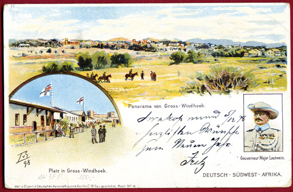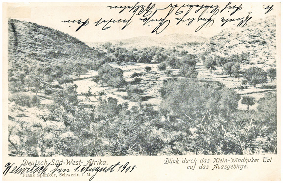 06.08.1905: Feldpost-Ansichtskarte "Blick durch das Klein Windhuker Tal auf das Auasgebirge" mit Stempel SWAKOPMUND an ein Fräulein "Bossenz /.. Herrn Dr. Borowsky" in BERLIN (18.9.05). Absender: Streckenaufseher Kruse "..bei der Eisenbahn-Verwaltung in Welwitsch b.Swakopmund".