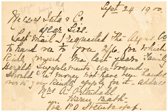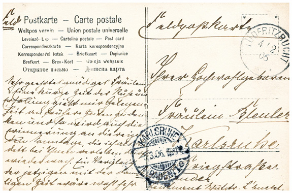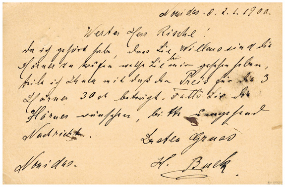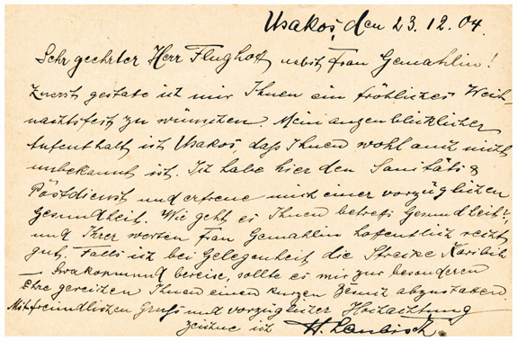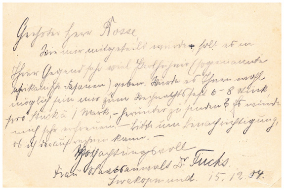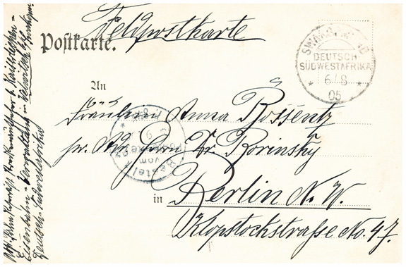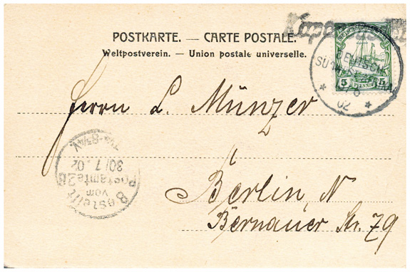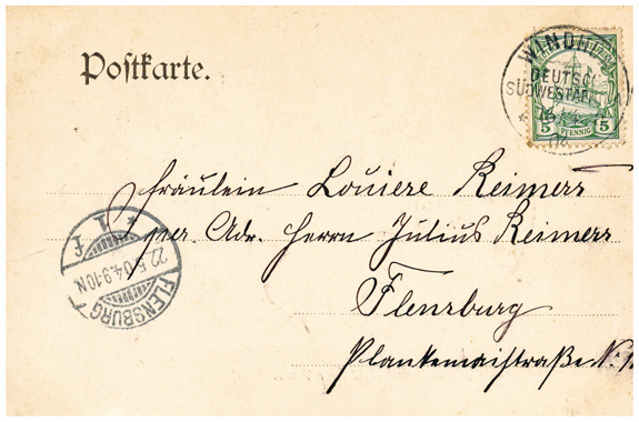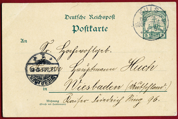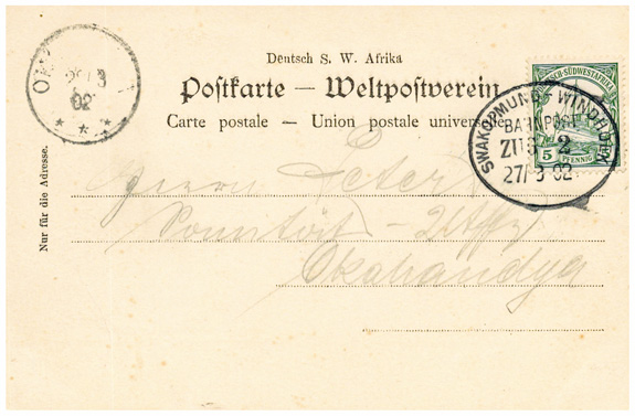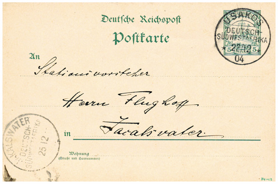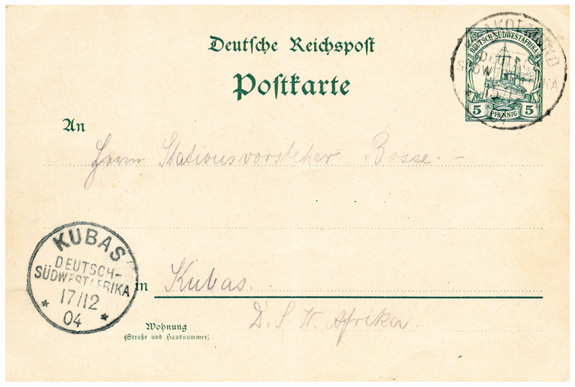 15.12.1904: 5Pf Inlands-GSK (Mi.P13) mit Stempel SWAKOPMUND an Herrn "Stationsvorsteher Bosse" in KUBAS (17.12.04); mit einer Bestellung von "Frau Staatsanwalt Dr.Fuchs". Neben seiner Tätigkeit als Stationsvorsteher, hatte Herr Bosse einen Kaufladen.