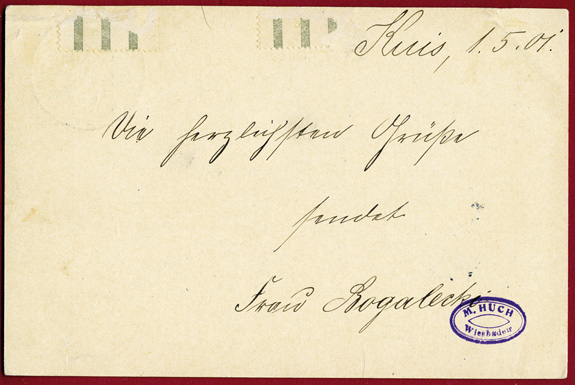 31.05.01: Ganzsachenpostkarte (Schiffszeichnung, Mi.P13) mit Stempel KUIS und Ankunftsstempel WIESBADEN (13.7.01); rückseitig Grußtext.