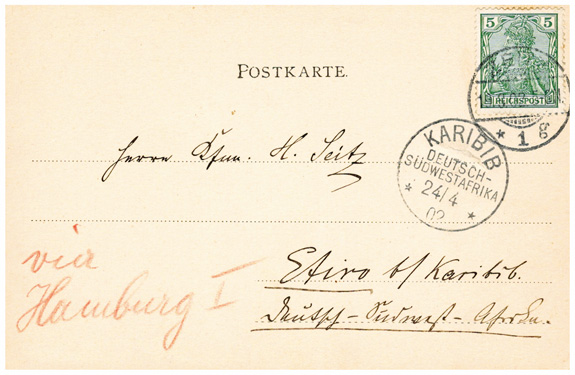 19.03.02: DR 5Pf mit Stempel ZEITZ auf AK mit rotem Leitvermerk "via Hamburg I" an den Kaufmann Sietz in Etiro bei KARIBIB (24.4.02).