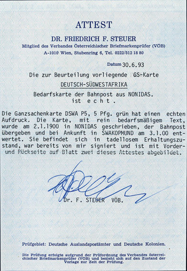 03.01.1900: 5Pf Inlands-GSK (Mi.P5) mit Stempel SWAKOPMUND (3.1.00) mit Bedarfstext über ein Geschäft von "H.Buck" aus "Nonidas, d.2.1.1900" an Herrn "Rische / Siedlungs-Haus / Swakopmund". Attest Dr.F.F. Steuer - "Bedarfskarte der Bahnpost aus NONIDAS ist echt..befindet sich in tadellosem Erhaltungszustand..". Unten rechts Eckbüge.