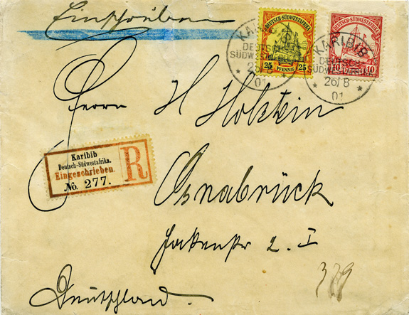 26.08.1901: 10Pf & 26PF (Mi.13,15) mit 2x Stempel KARIBIB auf R-Brief mit R-Zettel "Karibib" (Type 2c) an Herrn H.Holstein in OSNABRÜCK (6.10.01). Absender ist F.Holstein "klm 289" / Feldbahnbau..". Die Bahn- & Poststation wurden am 01.10.1901 eröffnet. Umschlag etwas unsanft geöffnet.