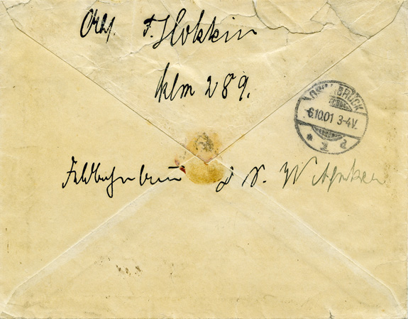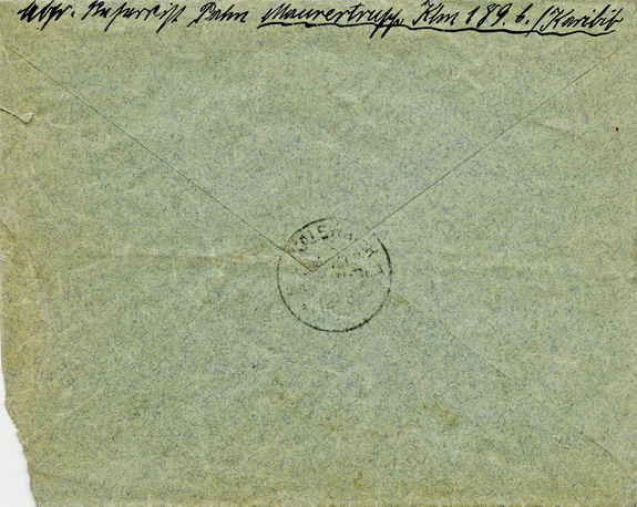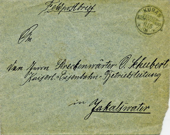 11.08.1904: Feldpost-Brief mit Stempel KUBAS an den "Streckenwärter O.Schubert / Kaiserl.Eisenbahn-Betriebsleitung" in Jakalswater (12.8.1904); rs Absender "..Maurertrupp Klm 189.6/Karibib". Mängel.